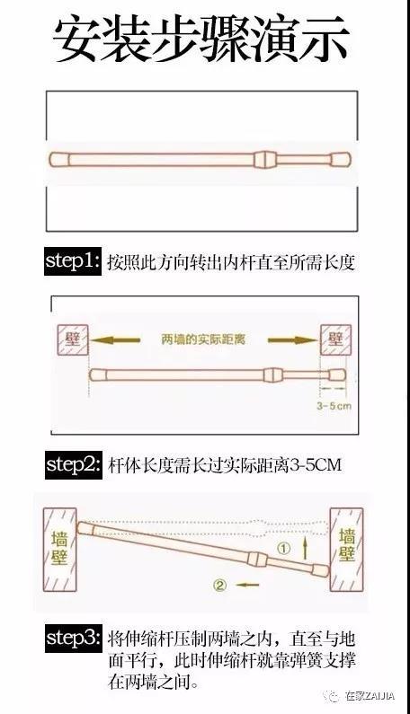 固定方法只需3步,看图秒懂!虽然简单到不用一根钉子,但是需要两侧有墙壁支撑。