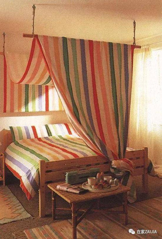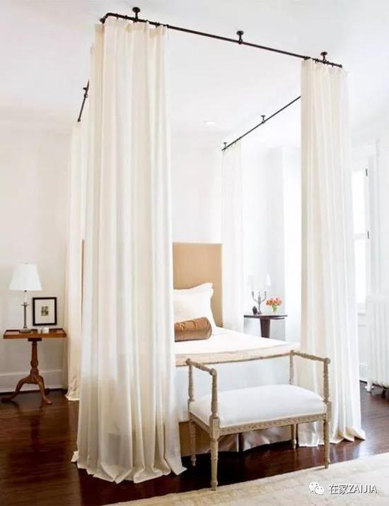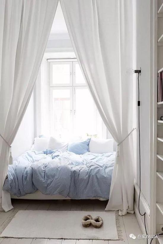 倾斜而下的厚布帘,还有一定保温、隔音功能,如果隔壁刚好是老人房、儿童房,也有个“私密缓冲区”;做个床头, 颜值不输法式大床!