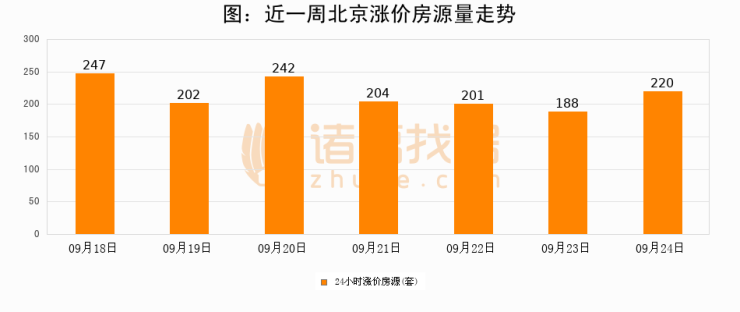 根据诸葛找房数据显示,北京24小时涨价房源量为220套,较09月23日增加32套,环比上涨17%。与此同时,涨价房源占比小幅扩大,业主信心有所提升。