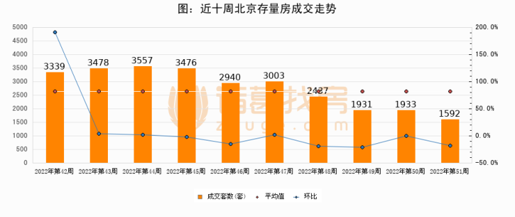 存量房方面,第51周北京存量房成交1592套,较上周减少341套,环比下降17.6%。从近十周成交走势来看,周均成交套数为2768套,本周低于平均水平42.5%。