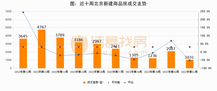 进入2022年第51周(12月12日-12月18日),北京新建商品房成交1031套,较上周减少1056套,环比下降50.6%。从近十周成交来看,周均成交套数为2645套,本周成交1031套,低于近十周平均成交量72.7%。