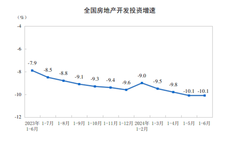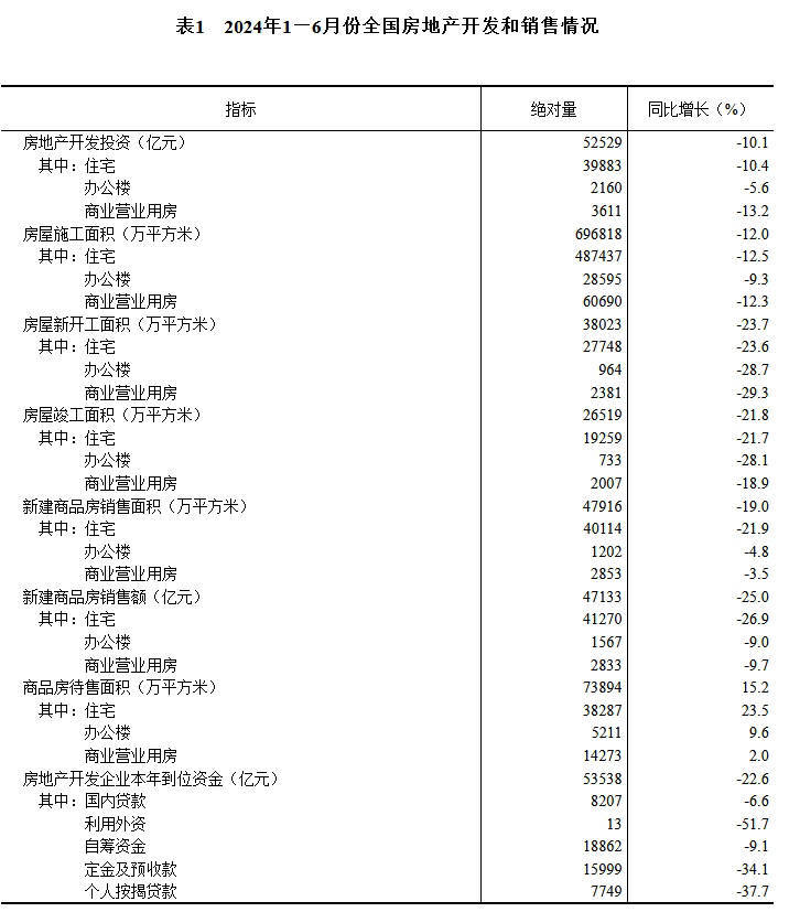 1—6月份,全国房地产开发投资52529亿元,同比下降10.1%(按可比口径计算,详见附注6);其中,住宅投资39883亿元,下降10.4%。
