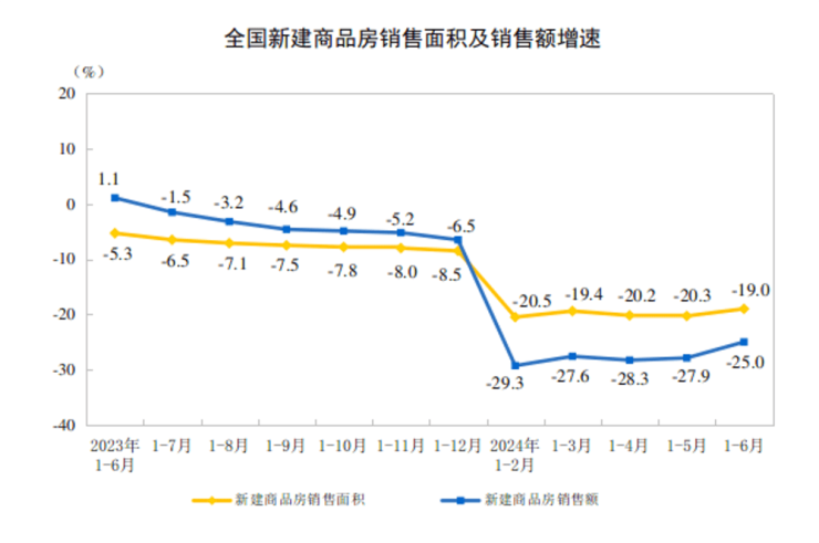 1—6月份,房地产开发企业房屋施工面积696818万平方米,同比下降12.0%。其中,住宅施工面积487437万平方米,下降12.5%。房屋新开工面积38023万平方米,下降23.7%。其中,住宅新开工面积27748万平方米,下降23.6%。房屋竣工面积26519万平方米,下降21.8%。其中,住宅竣工面积19259万平方米,下降21.7%。