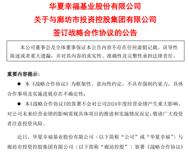 华夏幸福与廊坊控股签订战略合作协议,有效期1年