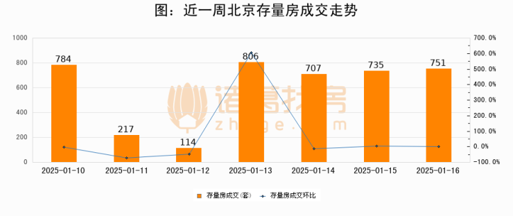 从存量房来看,2025年01月16日北京存量房单日成交751套,比昨日增加16套,环比上涨2.2%。从近一周存量房成交来看,北京存量房日均成交套数为587套,01月16日单日成交751套,高于近一周平均水平27.9%。