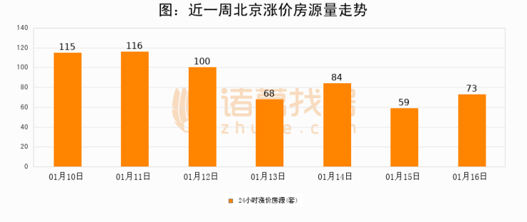 根据诸葛找房数据显示,北京24小时涨价房源量为73套,较01月15日增加14套,环比上涨23.7%。与此同时,涨价房源占比小幅扩大,业主信心有所提升。