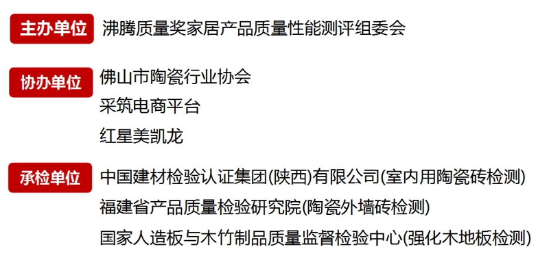 如今,市场上陶瓷砖、木地板品牌繁多,产品种类更是琳琅满目,但是品质却参差不齐,给消费者选购产品带来诸多困扰。加之,随着消费升级时代的到来,消费者对于陶瓷砖、木地板产品的质量要求越来越高,消费者已经不再仅仅满足于购买合格产品,而是质量更加可靠、性能更加先进的好产品。 然而,由于陶瓷砖、木地板本身的专业性,普通消费者通常很难辨别产品质量优劣,到底哪些陶瓷砖、木地板更加耐磨?哪些陶瓷砖、木地板更加环保?哪些陶瓷砖更加易洁?哪些陶瓷砖更加防滑?哪些木地板更加耐烧?哪些木地板更加耐用?消费者无从得知,品牌的自我宣传又缺乏客观说服力。那么,有什么更好的方式为消费者推荐质量性能更优的陶瓷砖、木地板产品呢? 沸腾质量奖作为由具有国抽资质的检测机构、行业协会、媒体、家居卖场与建材集采平台等共同开展的权威产品质量性能测评活动,从关注消费者需求出发,希望通过专业、客观、高标准的测评,筛选一批质量性能优秀的陶瓷砖、木地板品牌和产品,为消费者选购高质产品提供一把科学的标尺。同时,也促进陶瓷砖、木地板企业进一步增强质量观念,不断提高产品质量,推动行业整体质量进步、提升。