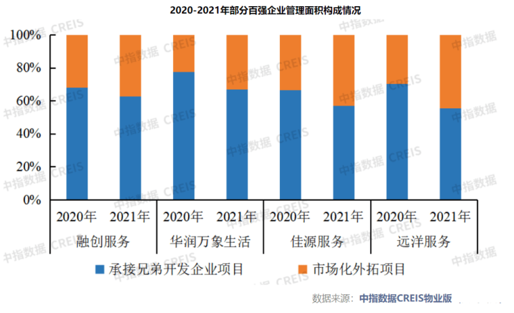 事实上,虽然经过多年发展,物业企业在管面积中来自母地产公司开发项目的比例仍占据主导。以部分物业企业为例,据中指物业研究统计,截至2021年12月31日,融创服务、华润万象生活、佳源服务、远洋服务等企业的在管面积中来自关联地产开发企业的占比仍保持在50%以上。