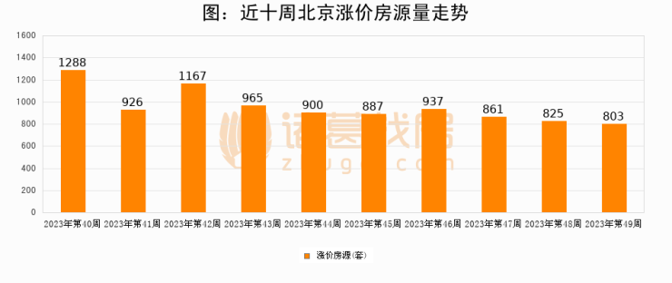 从调价房源来看,第49周北京涨价房源803套,较上周下降2.7%。与此同时,49周涨价房源占比提升0.63个百分点,业主信心持续恢复。