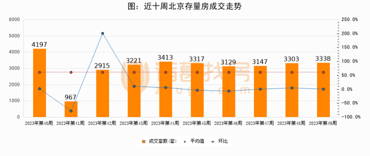 存量房方面,第49周北京存量房成交3338套,较上周增加35套,环比上涨1.1%。从近十周成交走势来看,周均成交套数为3094套,本周高于平均水平7.9%。