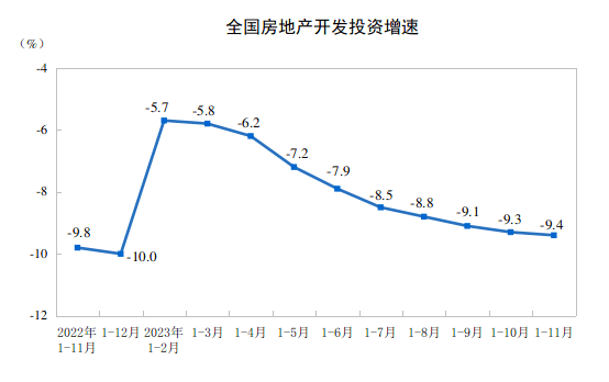 根据统计局数据显示,1-11月份,全国房地产开发投资104045亿元,同比下降9.4%;其中,住宅投资78852亿元,下降9.0%。