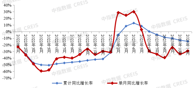 今年1-11月份,商品房销售面积100509万平方米,同比下降8.0%,其中住宅销售面积下降7.3%;
