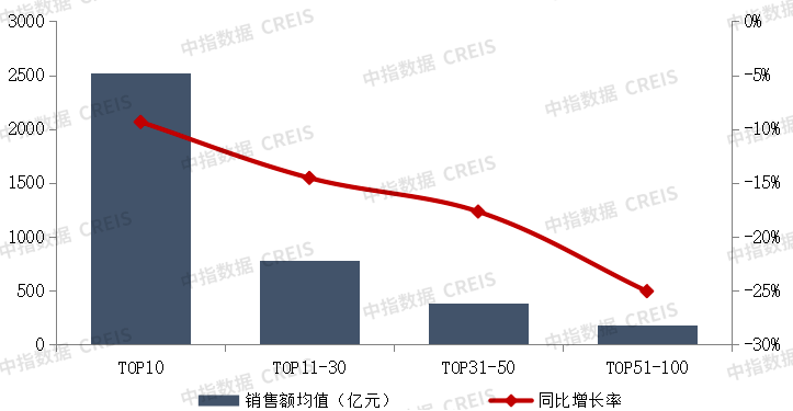 TOP51-100房企销售额均值为179.4亿元,同比下降25.1%。