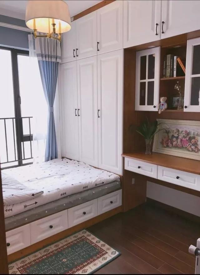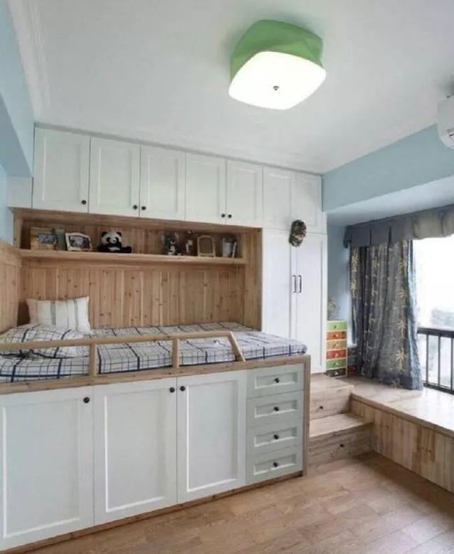 或者是做个榻榻米的改版,同样是把床给抬高一部分,加上楼梯,底部的收纳空间会更加的充足一些,这样做安全性也很高。