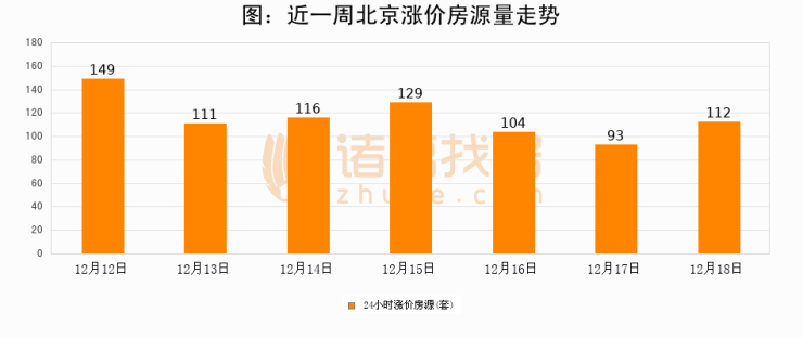 根据诸葛找房数据显示,北京24小时涨价房源量为112套,较12月17日增加19套,环比上涨20.4%。与此同时,涨价房源占比小幅扩大,业主信心有所提升。