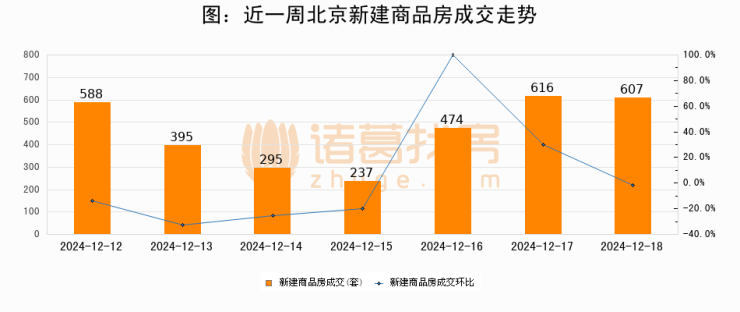 根据北京市住房和城乡建设委员会数据显示,2024年12月18日北京新建商品房成交607套,较昨日减少9套,环比下降1.5%