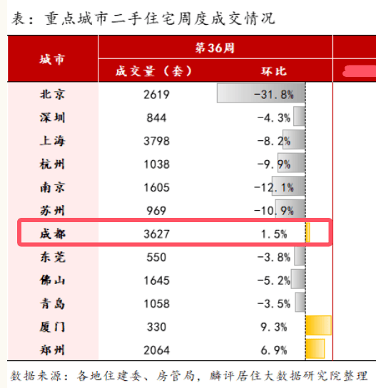 麟评居住大数据研究院监测数据显示,今年第36周(9月2日至8日)点10城二手房成交量环比下降11.07%,仅厦门、郑州、成都三城成交量环比上升,其中成都二手住宅成交3627套,环比增长1.5%。同时,来自成都购房通的数据显示,自8月15日成都“以旧换新”政策发布以来,截至9月8日不到一个月时间里,成都二手房成交量已超过12000套。