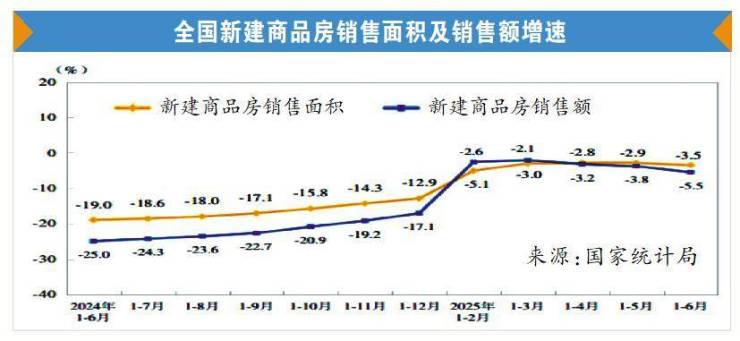 根据国家统计局发布的2025年上半年全国房地产市场基本情况,上半年,新建商品房销售面积45851万平方米,同比下降3.5%;其中住宅销售面积下降3.7%。新建商品房销售额44241亿元,下降5.5%;其中住宅销售额下降5.2%。6月末,商品房待售面积76948万平方米,比5月末减少479万平方米。其中,住宅待售面积减少443万平方米。