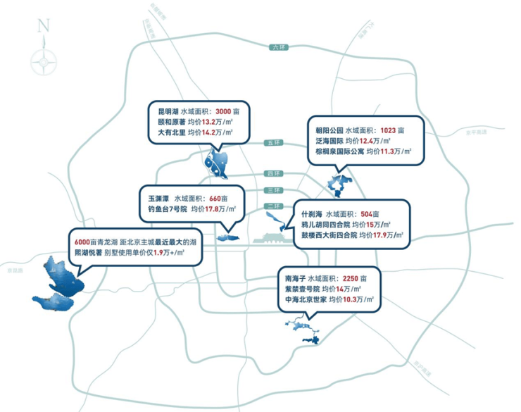 聚焦北京城市水域,所处中心城区的不是用来当做景点,便是已开发至极,即使是二手房的价格也早已突破10万元/㎡,最高均价已至18万元/㎡。