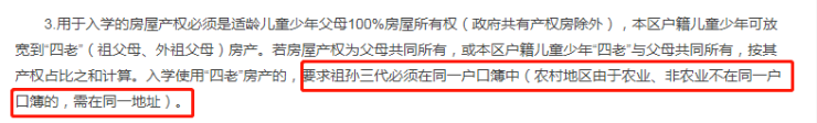 参考2023年顺义区义务教育阶段入学工作意见的通知:入学使用“四老”房产的,要求祖孙三代必须在同一户口簿中(农村地区由于农业、非农业不在同一户口簿的,需在同一地址)。