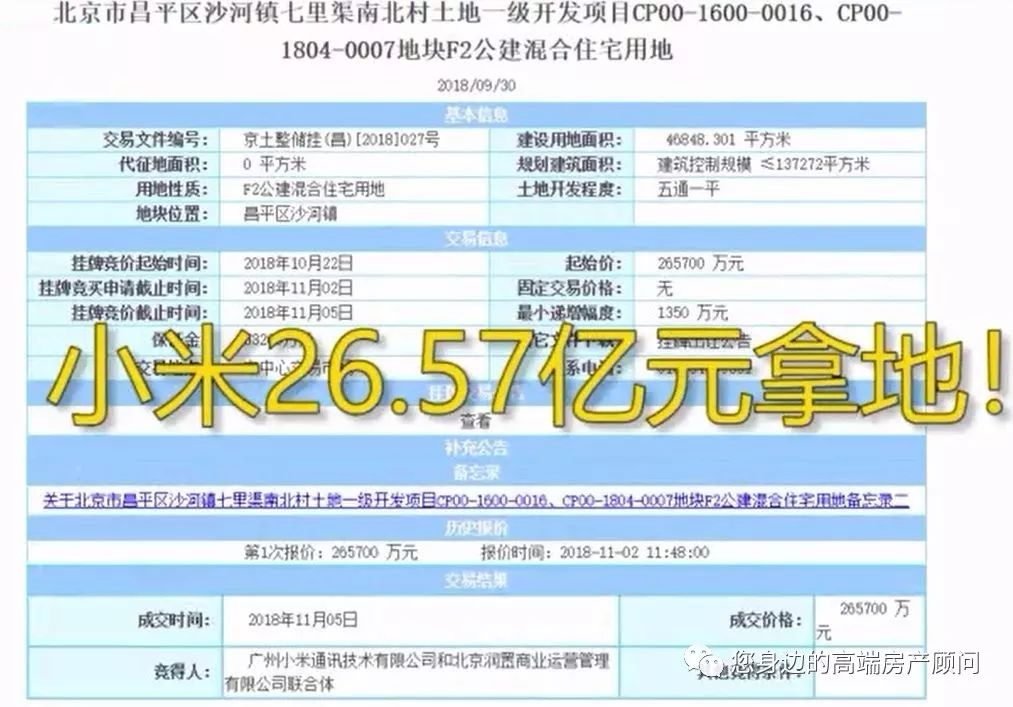 11月5日晚间,一张海报在网上流传:上面印有小米和华润置地的logo,正文是“支持实体经济,助力产业发展”,海报下面显示恭贺小米科技携手华润置地荣摘昌平区沙河镇七里渠南北村公建混合住宅项目地块。
