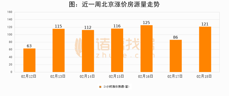 根据诸葛找房数据显示,北京24小时涨价房源量为121套,较02月17日增加35套,环比上涨40.7%。与此同时,涨价房源占比小幅扩大,业主信心有所提升。