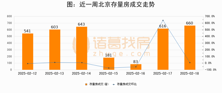 从存量房来看,2025年02月18日北京存量房单日成交660套,比昨日增加44套,环比上涨7.1%。从近一周存量房成交来看,北京存量房日均成交套数为475套,02月18日单日成交660套,高于近一周平均水平38.9%。