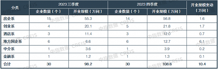 从开业规模看,房企系开业规模保持明显的领先优势,累计开业规模达56.8万间,在TOP30住房租赁企业中占比过半;地方国企系四季度开业规模增量突出,6家地方国企系合计新增开业6.1万间,在TOP30企业中占比近六成。