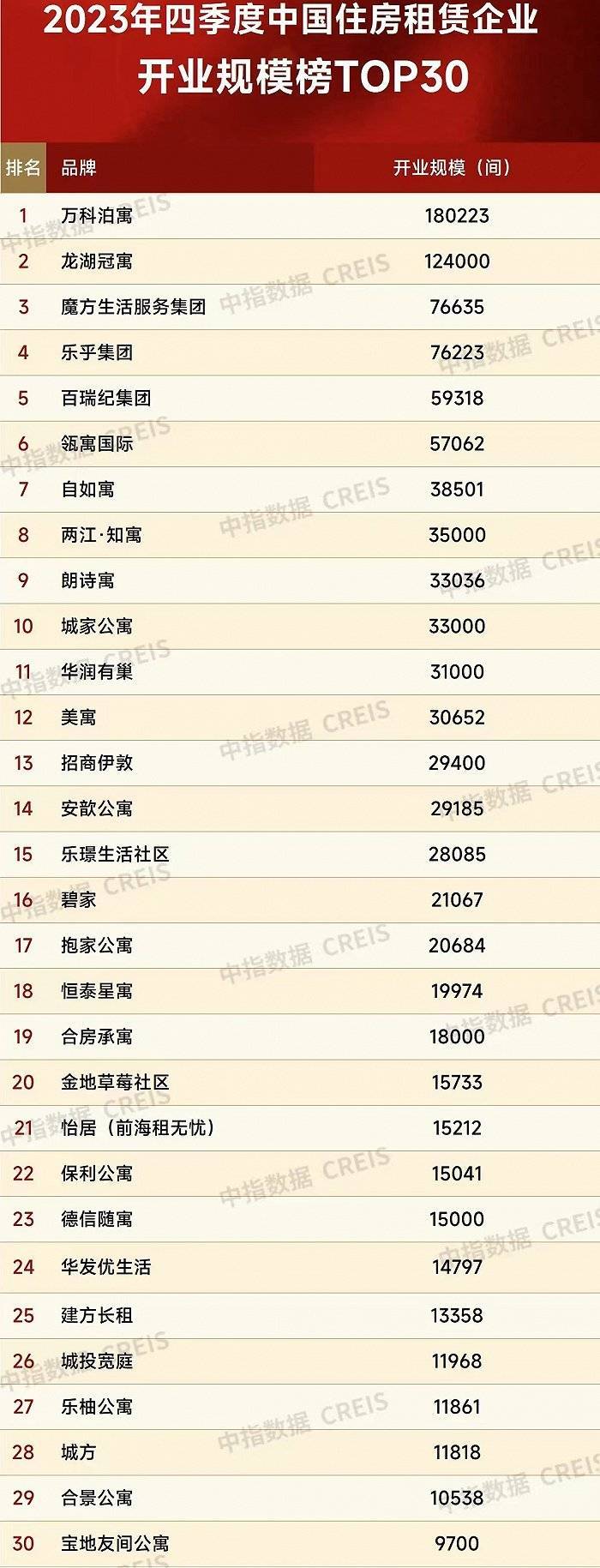 具体到企业,2023年四季度,万科泊寓的开业数量达到18.02万间位居行业第一,龙湖冠寓为12.4万间排名第二,魔方生活服务集团以7.66万间排名行业第三。
