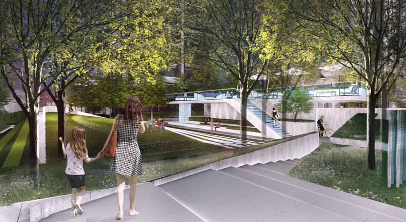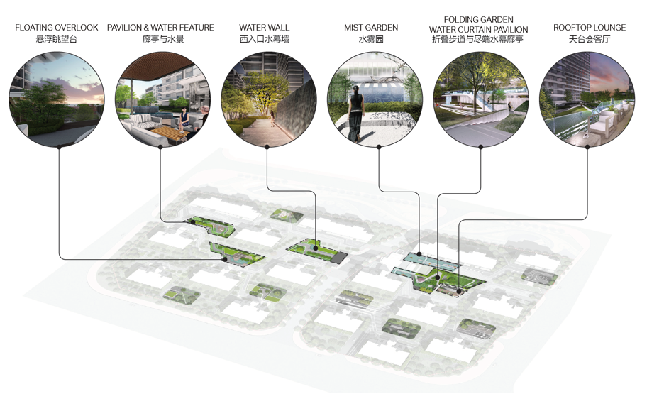 南侧地块设计了6处具有特色景观组团;悬浮眺望台、廊庭与水景、西入口水幕墙、水雾园、折叠步道与尽端水木廊亭、天台与会客厅。