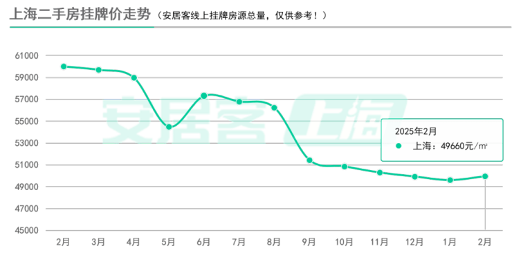 另据安居客平台数据,2月,上海二手房挂牌均价(仅安居客)为49660元/平方米,1月二手房挂牌均价(仅安居客)为49610元/平方米,环比上涨0.1%,这是自2024年6月连续七个月下跌后的首次上涨。