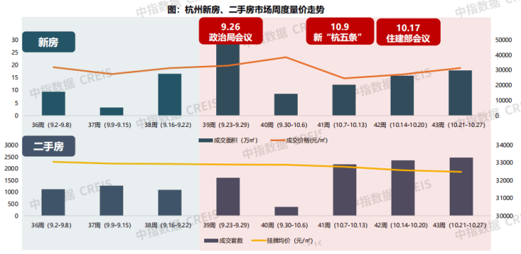 新政前后成交数据变化显著,新政前,杭州新房周均成交面积9.74万平方米,新政后周均成交16.61万平方米,如果剔除国庆长假的干扰,周均成交可达18.61万平方米,环比增长91.1%。