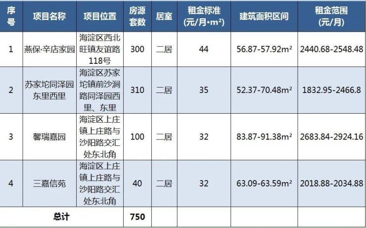 此次配租项目为燕保·辛店家园、苏家坨同泽园东里西里、馨瑞嘉园、三嘉信苑4个项目750套房源,均由北京保障房中心有限公司持有并运营。具体情况如下: