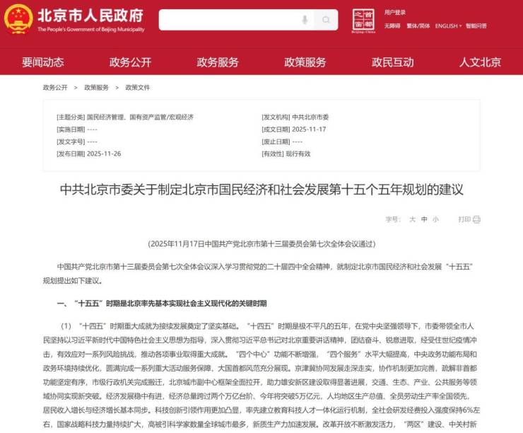 11月26日,《中共北京市委关于制定北京市国民经济和社会发展第十五个五年规划的建议》(以下简称《建议》)发布,将房地产政策纳入“着力保障和改善民生”重点任务,明确以“持续推进住有所居”为目标,推动房地产发展模式转型与品质升级。
