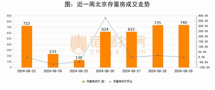 从存量房来看,2024年08月29日北京存量房单日成交740套,比昨日增加5套,环比上涨0.7%。从近一周存量房成交来看,北京存量房日均成交套数为543套,08月29日单日成交740套,高于近一周平均水平36.3%。
