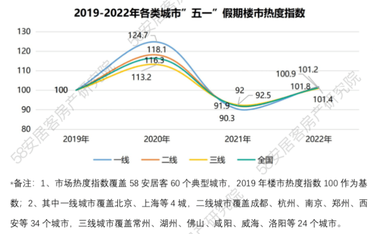 58安居客房产研究院统计数据显示,4月30日-5月4日,全国楼市热度指数为101.2,而2021年”五一”期间热度为92.0,同比增加10%。
