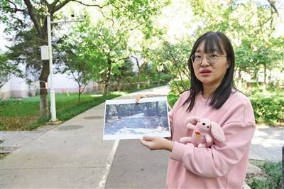 9月23日,昌平区龙泽苑社区党委副书记迟伟琛举着老照片,展示该社区2018年以前破损的水泥路面。A06-A07版摄影/新京报记者 王颖
