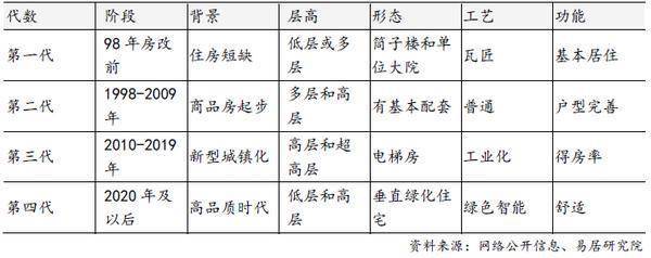 近年来,“第四代住宅”概念越来越火,体现了住宅产品变革导向。基于全国居民家庭历史上的住房情况和需求、住房制度改革和阶段划分等内容,同时把握房地产业从“有没有”到“好不好”的行业规律等新情况,易居研究院将四代住宅分为四个阶段:1998年住房制度改革前的住房、1998-2009年的住房、2010-2019年的住房、2020年以后的住房。