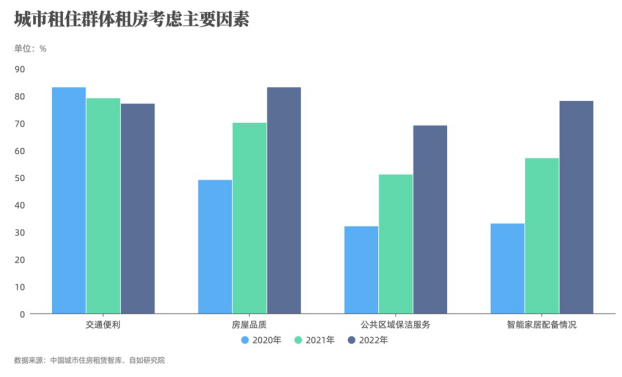 此外,居家时间的明显延长,也让租住群体更偏重于“居住体验型因素”。数据显示,三年来,租住群体在选房时对交通便利的在意程度下降了5%,而对于房屋品质、公共区域保洁服务、智能家居配备情况的在意程度分别提升了34%、37%、45%。“有服务、有智能、有品质、有空间”的“改善型”需求,已然成为新的租房刚需。