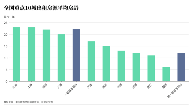 出租不理想的背后,是这类闲置房屋普遍存在的房屋品质不足、生活服务缺失、合规性挑战等问题。从受调研的10个主要城市来看,租房市场的房源多以老房为主。其中,北京、上海、深圳、广州四大一线城市出租房源的平均房龄超过22年,目前装修合理使用年限在10-15年,老龄化房源存在一定的户型陈旧、装修老化等问题。而成都、武汉、杭州等新一线城市的出租房源虽然更“年轻”,平均房龄也在12年左右,但是因为新城区、卫星城区房源占比高,毛坯房、简装房较为常见。