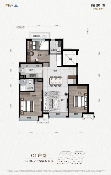 107平三居,是项目的主力户型,南向面宽9.49米,户型方方正正,南北通透,全屋子的采光也非常好;客厅+双卧朝南都带飘窗,双卫生间;后期有需求的话,可以把南北双卧室打造为两个套房。入户玄关,收纳空间做的非常好,可以做成入户衣帽间。餐厅旁也特别设计了收纳空间,实现餐边柜和酒柜的功能。