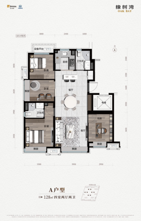 128平米四居是小区最大面积,集中在小区的中间部分。三面采光,南向面宽达到了10.4米;餐厅客厅区一体,客厅+双卧朝南,主卧套房设计。