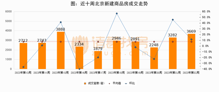 进入2023年第52周(12月18日-12月24日),北京新建商品房成交3669套,较上周增加387套,环比上涨11.8%。从近十周成交来看,周均成交套数为2859套,本周成交3669套,高于近十周平均成交量28.3%。