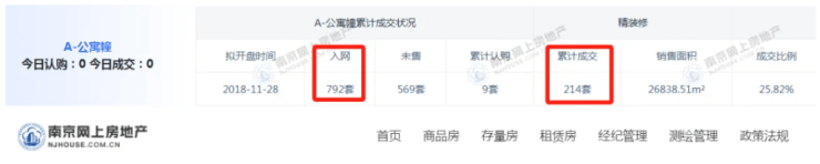 据南京网上房地产信息,世茂天誉公寓部分共备案792套房源,单价4.6万~6万元/平方米,已成交214套,去化率约27%。