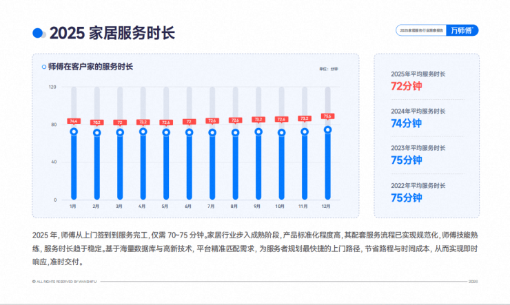 现如今,80后、90后已成为服务者主力,普遍接受过更系统的技能培训,对数字化工具的接受度更高。以万师傅平台为例,从上门签到到服务完工,2025年平均服务时长稳定在72分钟。