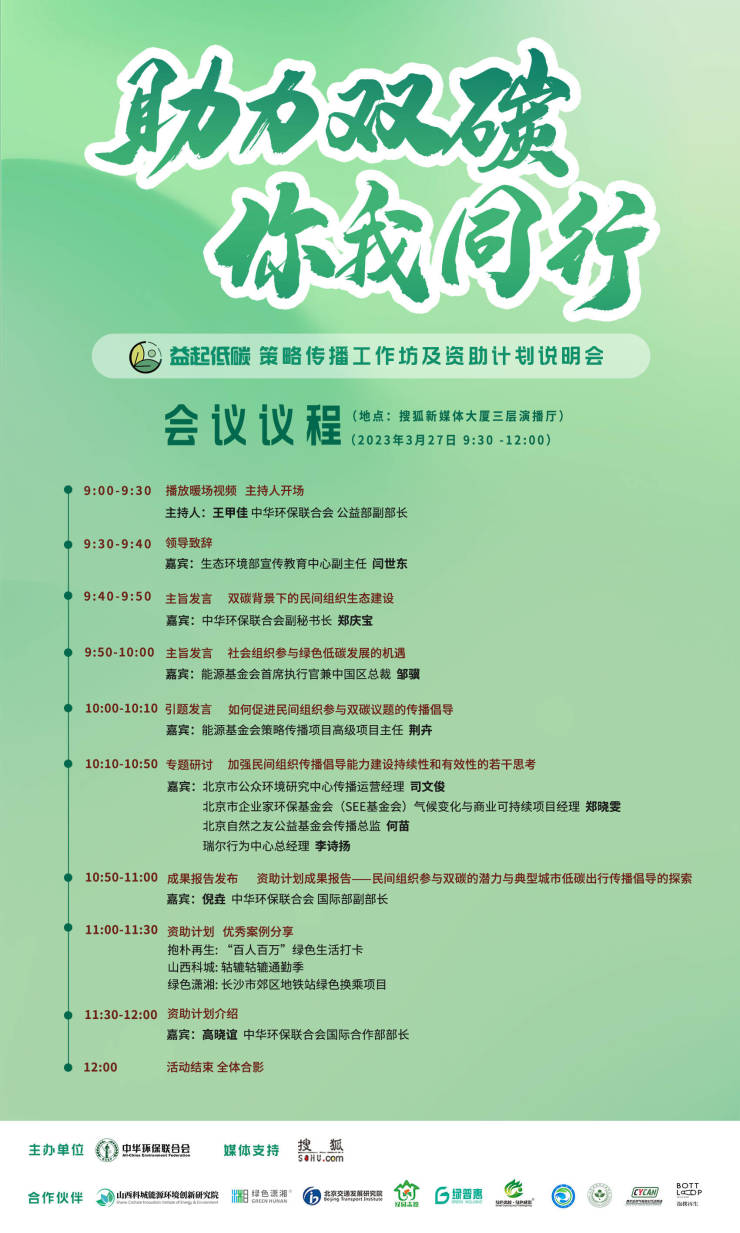 为促进民间组织以多元视角和创新策略参与双碳议题,分享本土机构在推动公众低碳生活方式转变上的思考,“益起低碳”策略传播工作坊及资助计划说明会将于2023年3月27日于北京举行。本次会议将围绕民间组织如何更好的参与双碳议题传播倡导开展研讨,分享资助计划一期、二期优秀案例和相关经验,并介绍资助计划下一步的聚焦议题和相关要求。