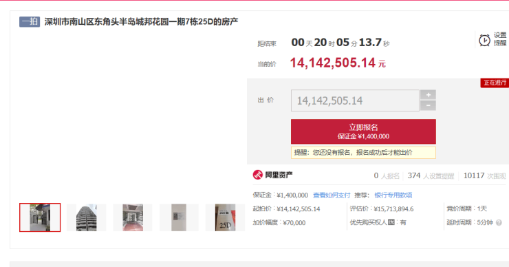 以深圳为例,南山区知名豪宅项目半岛城邦花园一期一套房源9月19日正在阿里法拍平台拍卖,一拍起价为1414万元,面积为121.4平方米,折合单价约11.64万元/平方米。