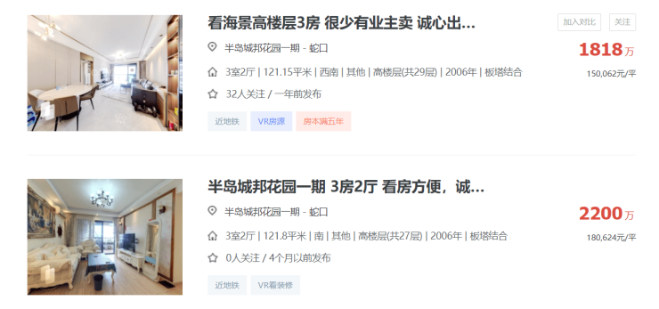 但在第三方平台,半岛城邦花园一期项目的同户型房源市场挂牌价普遍在15万元/平方米以上,有的甚至超过18万元/平方米。
