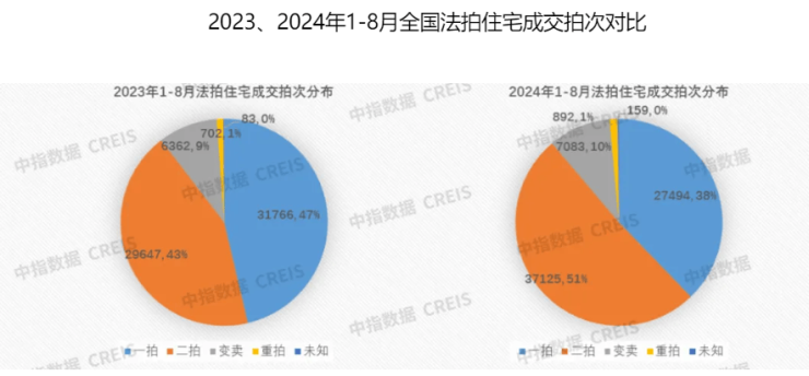前8月法拍住宅在各拍次中一拍成交2.7万套,占比37.8%,同比减少约8.5个百分点;二拍成交3.7万套,占比51%,同比增加约7.8个百分点。