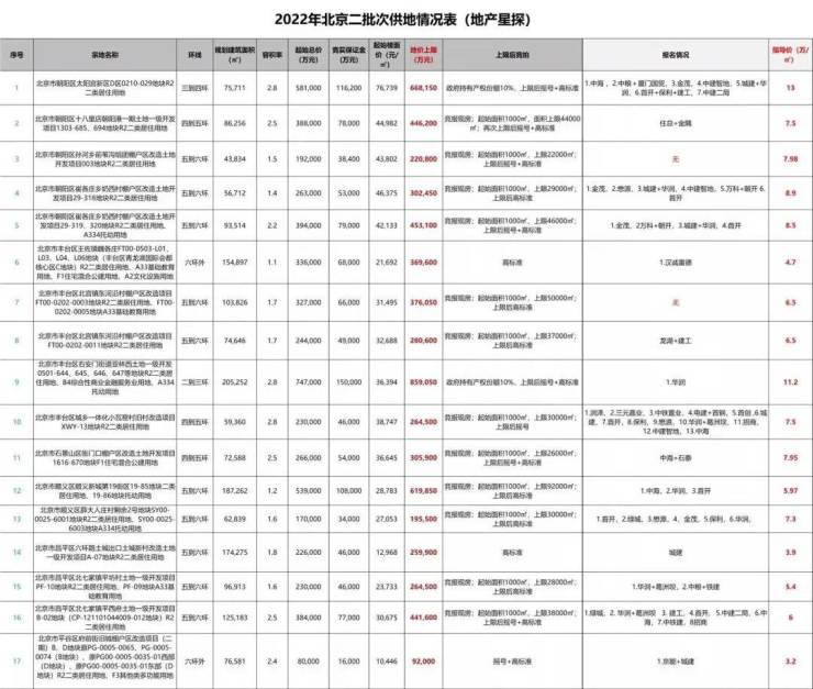 报名房企:润泽,三元嘉业(首农发展),电建+首钢,中铁置业,首开,华润+葛洲坝,城建,中建智地,懋源,保利,招商,首创,中海。